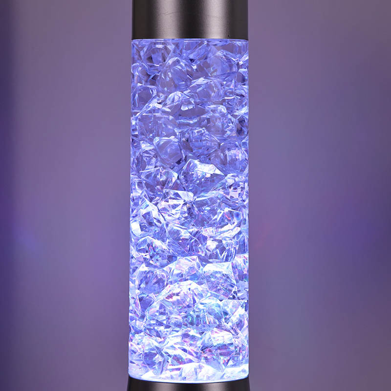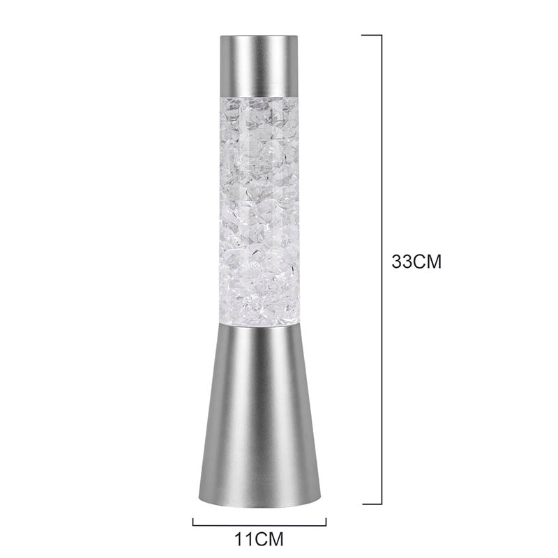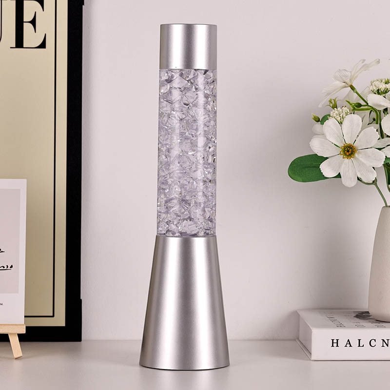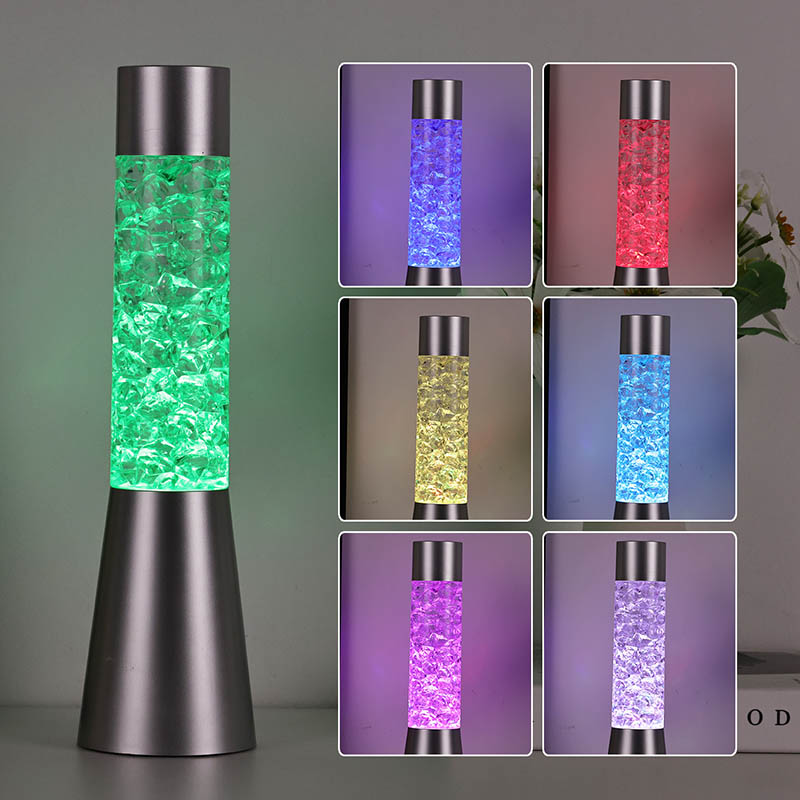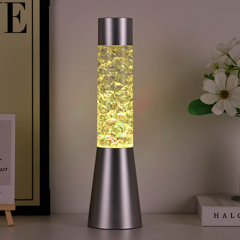 Das farbwechselnde flüssige Glitzer-Nachtlicht mit eisähnlicher Form verfügt über ein schlankes und modernes Design mit einer metallischen Basis und einem transparenten oberen Teil, der mit bunten, kristallähnlichen Teilen gefüllt ist. Der Sockel der Lampe ist stabil und elegant gestaltet und passt zu jedem Einrichtungsstil. Der transparente Bereich beherbergt die bunten Teile, die sich sanft bewegen und so einen faszinierenden visuellen Effekt erzeugen. Die Lampe ist in drei verschiedenen Farbvarianten erhältlich – Rot, Blau und Grün – sodass Sie den perfekten Farbton wählen können, der zu Ihrer Inneneinrichtung passt.