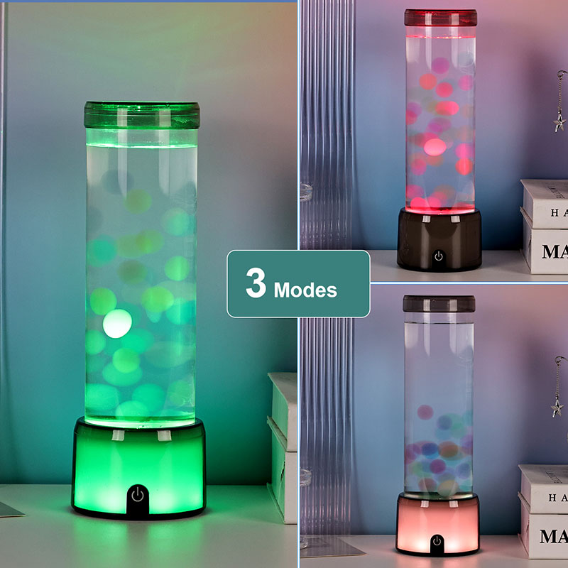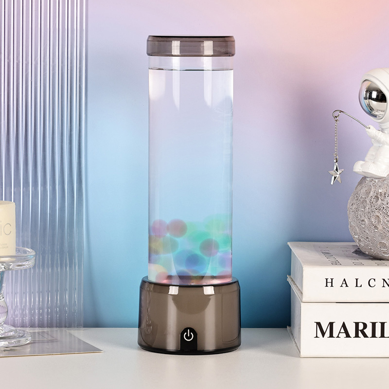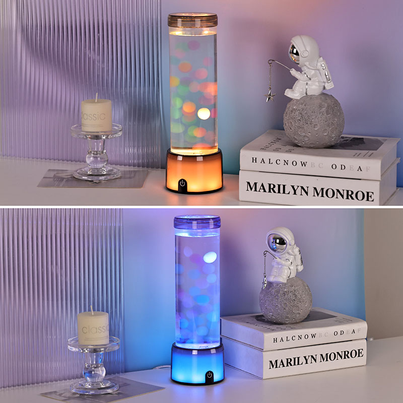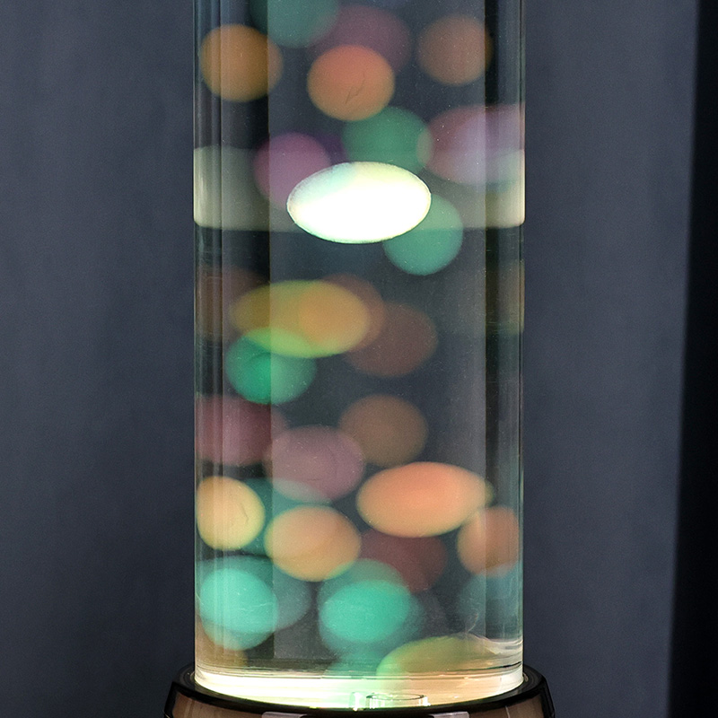 Die hohe, elegante Zylinderform der Lampe verleiht ihr einen modernen, minimalistischen Look, der zu verschiedenen Einrichtungsstilen passt. Sein transparenter Körper ermöglicht die volle Sicht auf die inneren Elemente, einschließlich der schwimmenden Quallen und der schimmernden Lichtreflexionen. Die Flüssigkeit im Inneren ist speziell formuliert, um den Wasserfluss zu simulieren und so den Realismus der Schwebebewegung zu verstärken. Während die Farben der LEDs wechseln, scheinen die Quallen vor Leben zu pulsieren, was der Szene Tiefe und Bewegung verleiht.