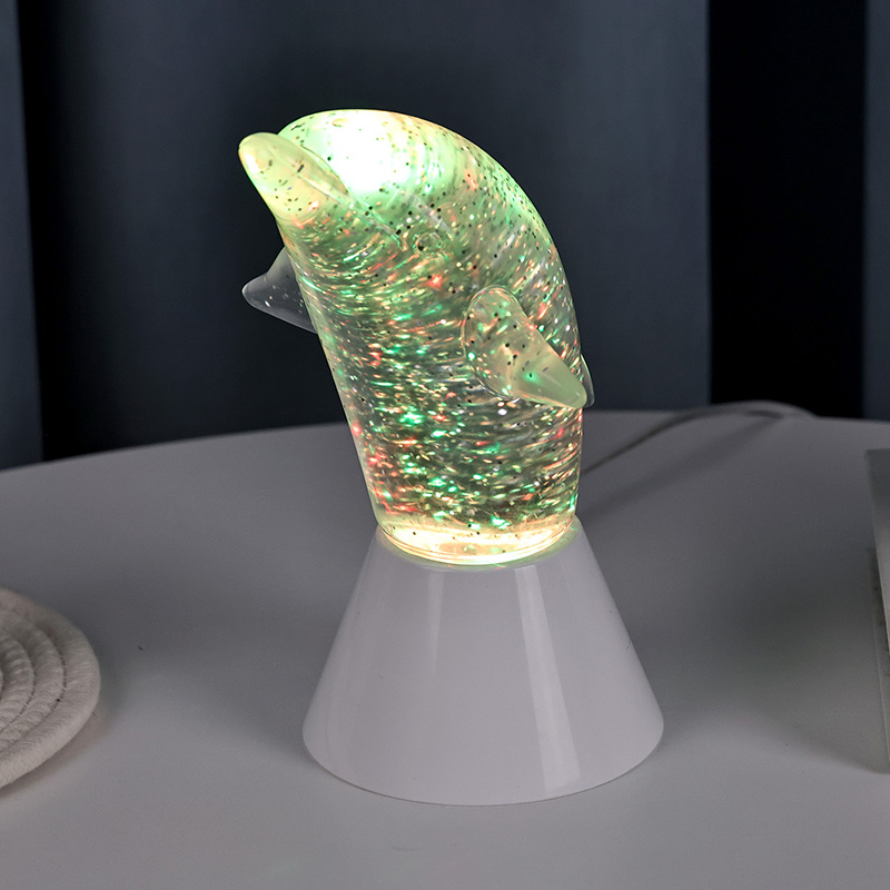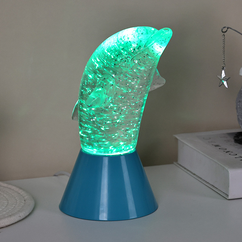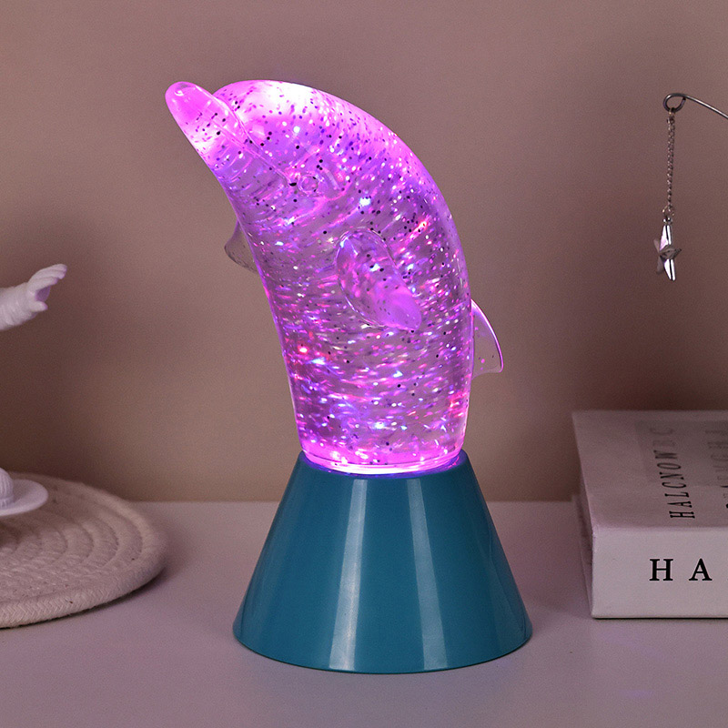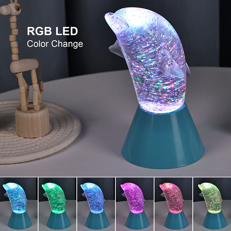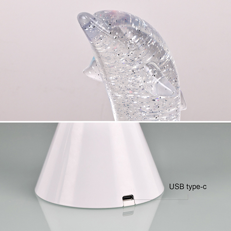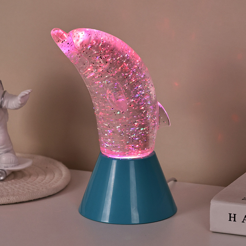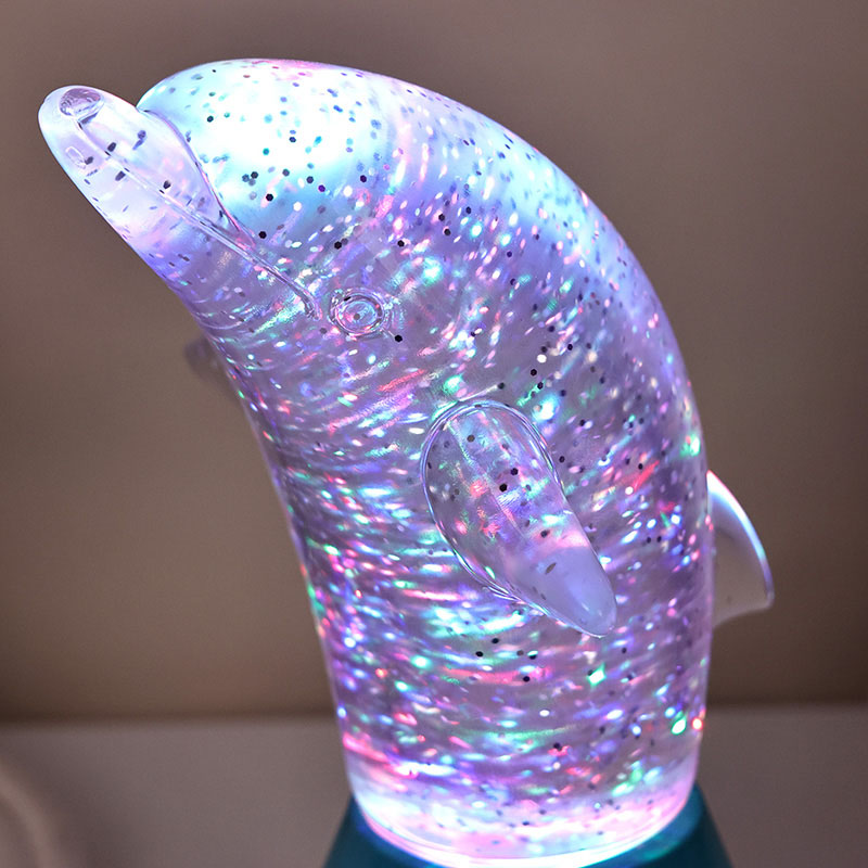 Dolphin Kid Gift Glitter RGB Nachtlicht ist in Form eines niedlichen Delfins gestaltet, mit glatten Linien und exquisiten Details, die die bewegliche Haltung von Delfinen perfekt wiederherstellen. Im Inneren der transparenten Delfinschale in Form von Pailletten können unregelmäßige Bewegungen die Farben wunderschön reflektieren und so eine friedliche und geheimnisvolle Atmosphäre schaffen. Jedes Mal, wenn Sie diese Lampe betrachten, haben Sie das Gefühl, in einem tiefen Ozean zu sein. Spüren Sie unter ihnen den unendlichen Charme der Natur. Ausgestattet mit fortschrittlicher RGB-Farbwechsel-Beleuchtungstechnologie, die es Ihnen ermöglicht, frei zwischen mehreren Farben zu wechseln. Ob warmes Orange, romantisches Rosa oder heiteres Blau,
