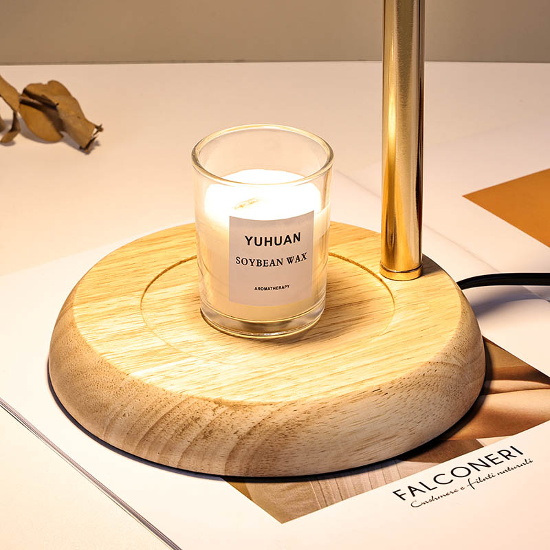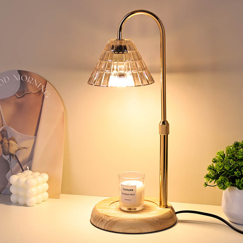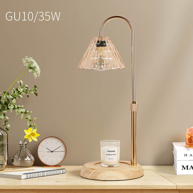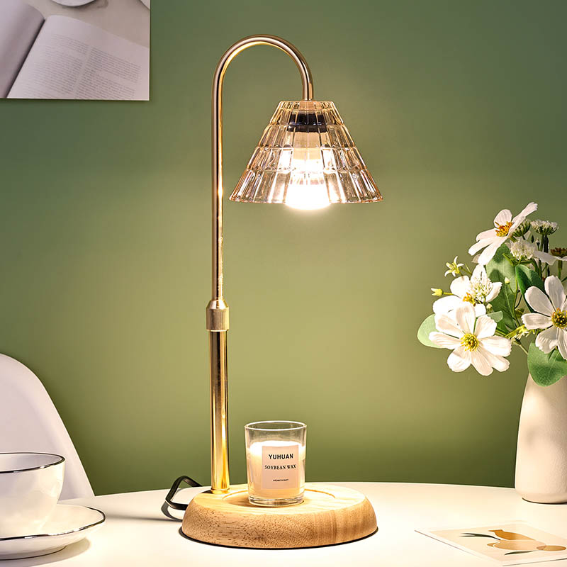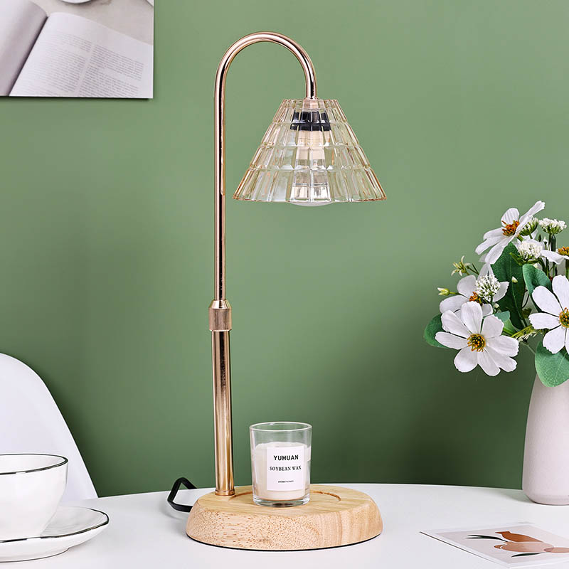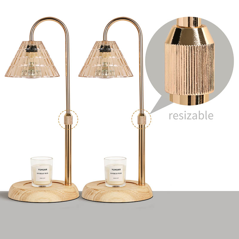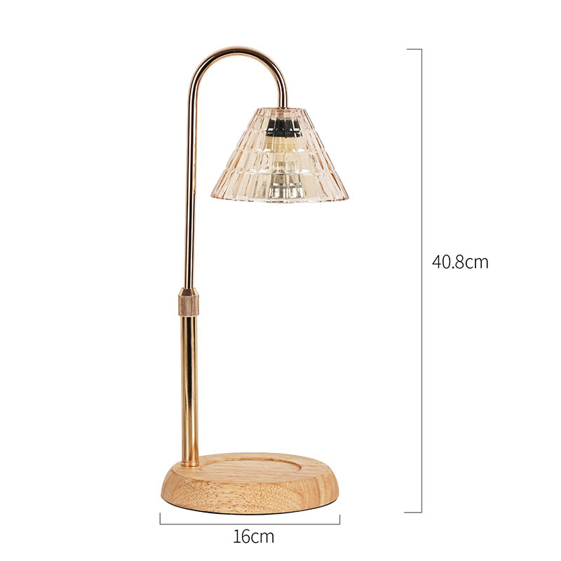 Die höhenverstellbare Glasschirm-Tischlampe ist ein traditioneller Designstil, der aus einer traditionellen Glühbirne mit Holzsockel und einem goldenen Metalllampenpfosten besteht.