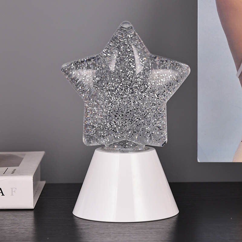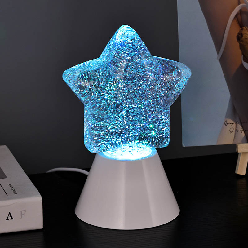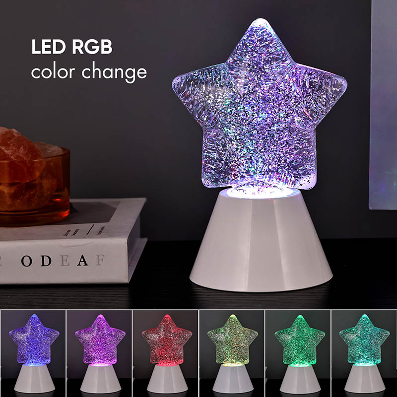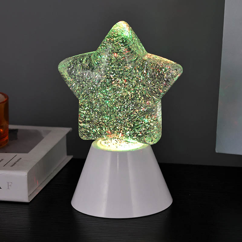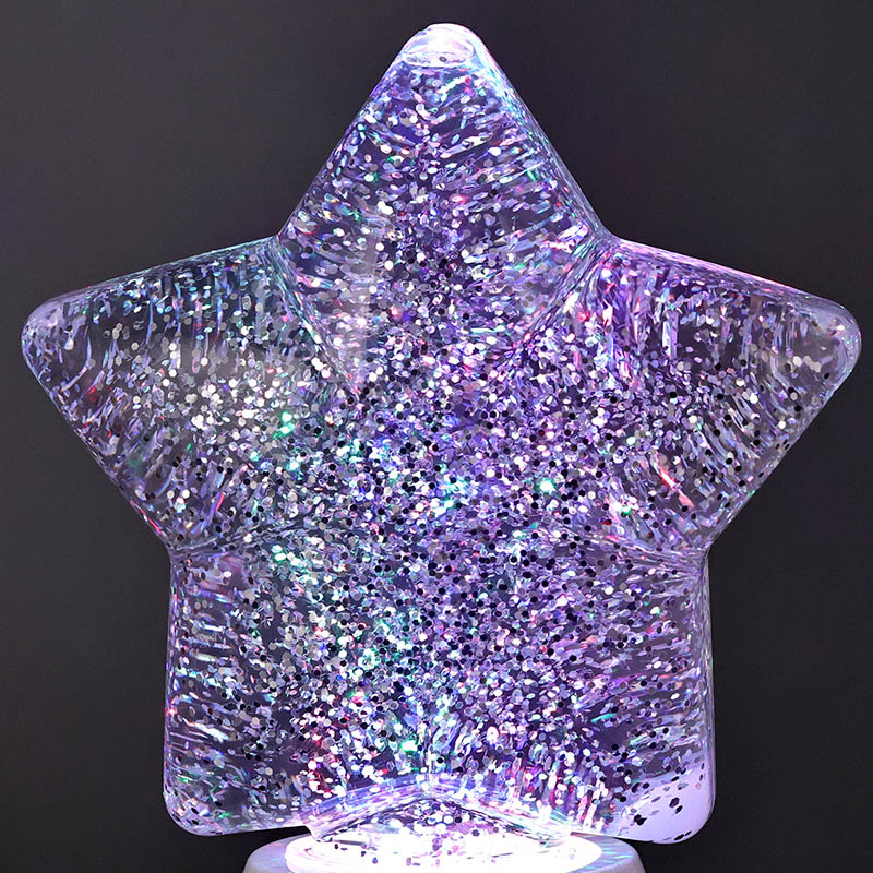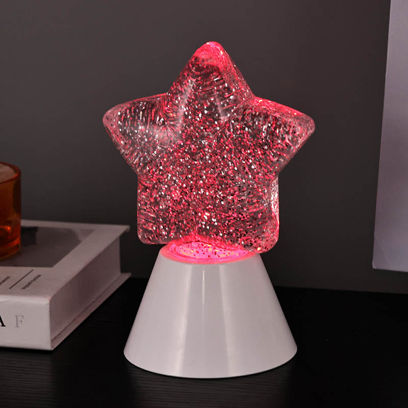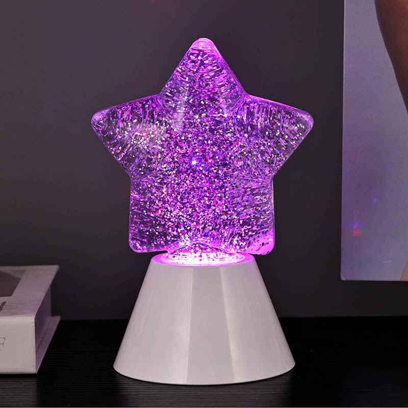 Kid Glitter Liquid Night Light mit weißer Basis verfügt über ein atemberaubendes, sternförmiges Design, das die Essenz der himmlischen Schönheit fängt. Diese Lampe aus hochwertigen Materialien hergestellt und verfügt über eine Basis aus undurchsichtigem Kunststoff, um die Haltbarkeit und Stabilität zu gewährleisten. Der Stern selbst ist mit schimmernden Glitzerpartikeln gefüllt, die in Flüssigkeit aufgehängt sind, wodurch ein faszinierender visueller Effekt erzeugt wird, wenn die Lampe aufleuchtet. Während die RGB -LED -Leuchten durch ein Spektrum von lebendigen Farben fahren, tanzt der Glitzer in sich und wirft ein Kaleidoskop aus funkelnden Lichtern, das Sie beeindruckt lässt.