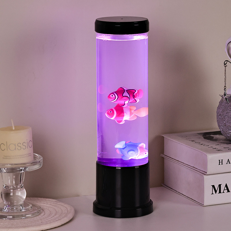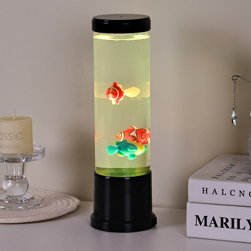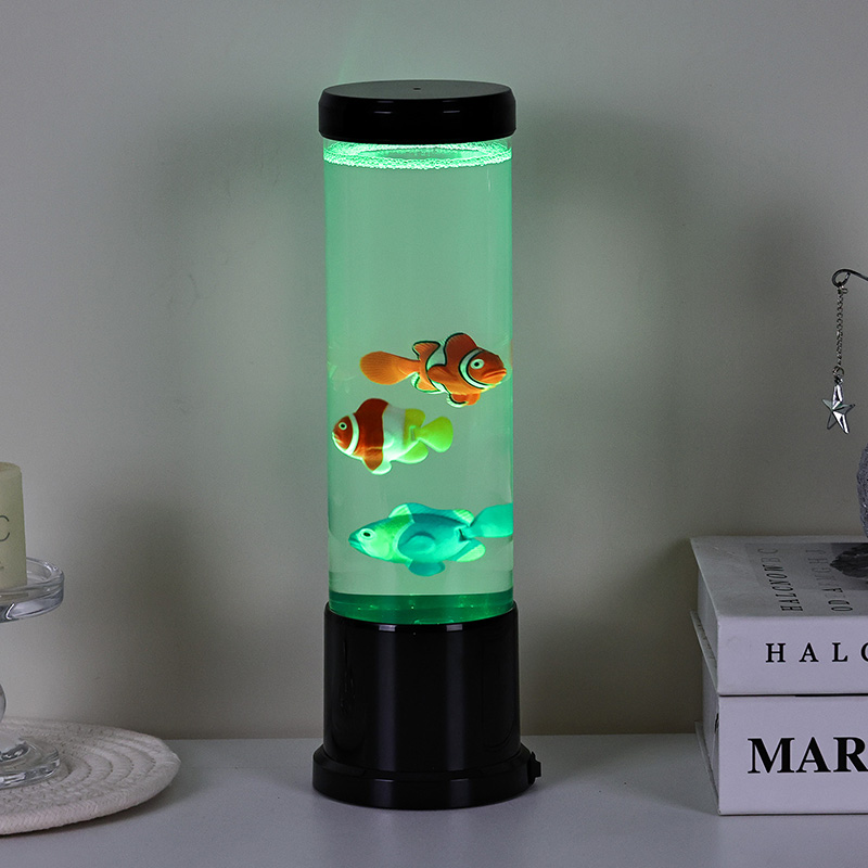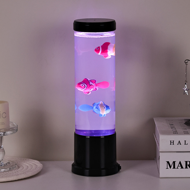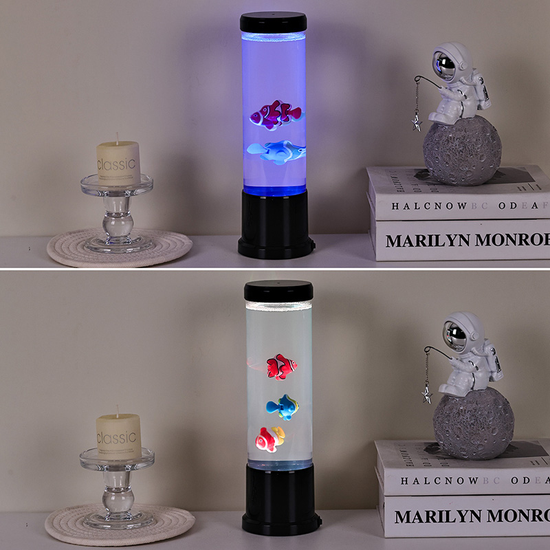 Das Herzstück dieser Lampe ist eine sorgfältig gestaltete Simulation eines echten Aquariums. In der durchsichtigen Säule finden Sie wunderschön detaillierte, schwimmende Fischfiguren – wie farbenfrohe Clownfische und andere tropische Arten –, die sich sanft durch die wasserähnliche Flüssigkeit bewegen und schwimmen. Die Zugabe leuchtender Quallen verstärkt die magische Unterwasserillusion, die sanft mit ätherischem Licht pulsiert. Durch die Kombination aus Bewegung und Farbe entsteht eine dynamische Szene, die Aufmerksamkeit erregt und Ruhe in Ihre Umgebung bringt.