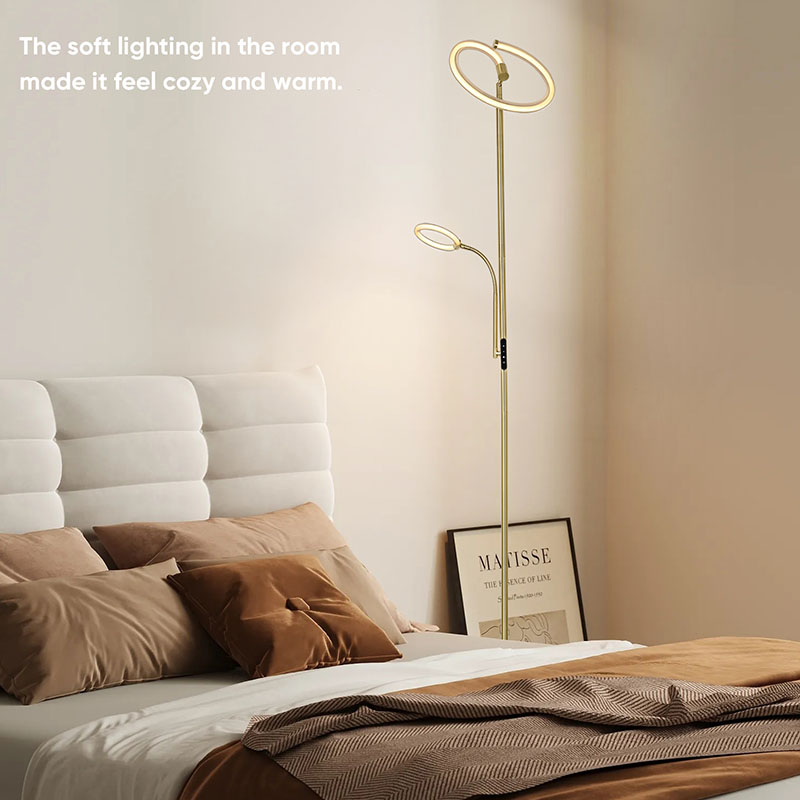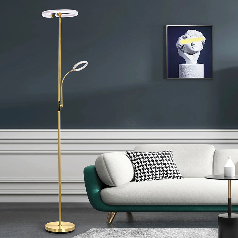 Studie, die luxuriöse goldene LED-Stehleuchte für das Wohnzimmer fügt sich perfekt in die Umgebung ein und unterstreicht den Geschmack und Stil des gesamten Raums