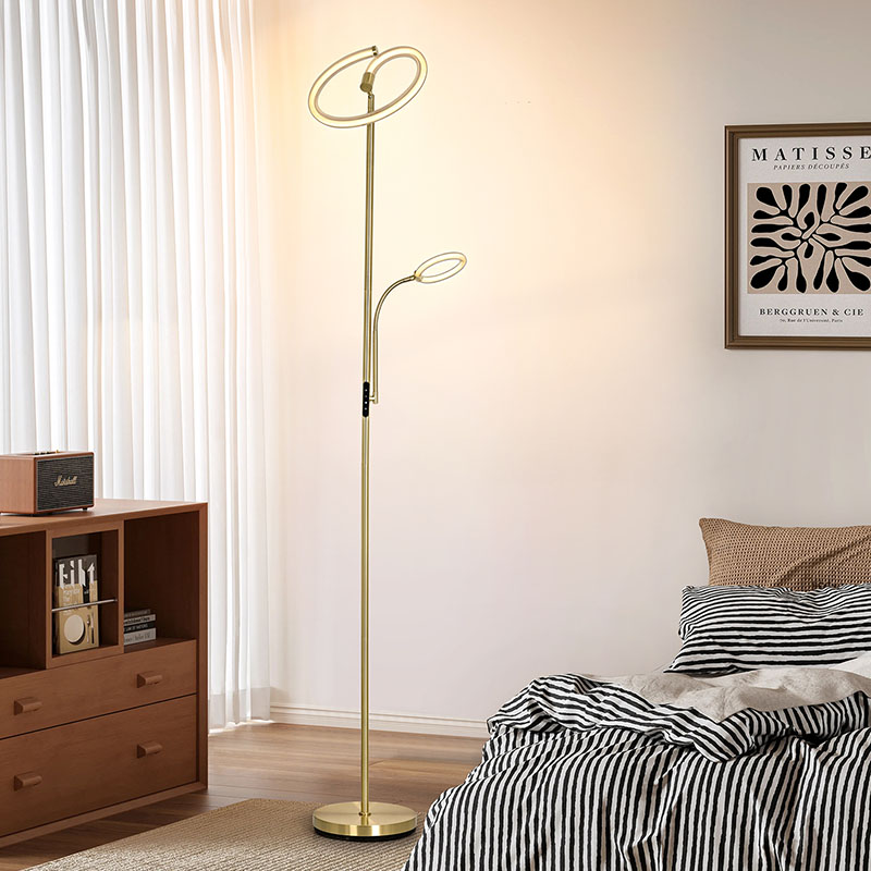 Die luxuriöse Gold-LED-Stehleuchte für das Wohnzimmer besteht aus hochwertigem goldenem Metallmaterial und hat ein schlichtes, aber luxuriöses Gesamtdesign. Das Metallmaterial wurde fein poliert und behandelt, mit einer glatten und zarten Oberfläche und einem sanften Glanz, was eine edle und elegante Atmosphäre vermittelt. Ob im Wohnzimmer, Schlafzimmer oder
