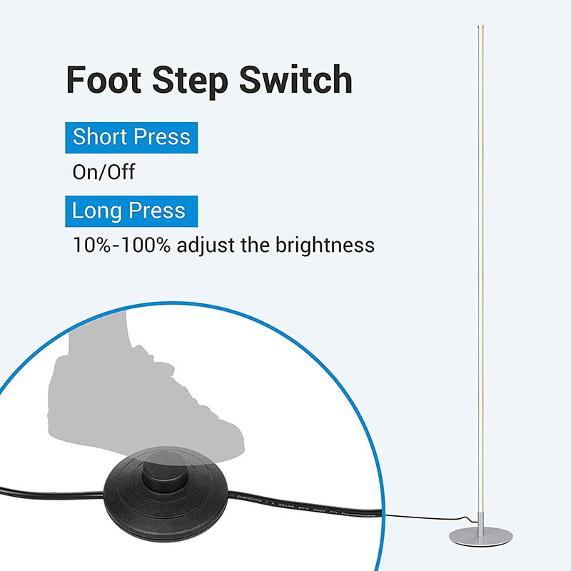 Unsere LED-Stehleuchte ist auf Komfort ausgelegt und verfügt über einen Fußschalter für eine einfache Bedienung. Treten Sie einfach auf den Schalter, um die Lampe ein- oder auszuschalten. So können Sie die Beleuchtung ganz einfach steuern, ohne nach Knöpfen oder Schaltern suchen zu müssen. Dieses durchdachte Designdetail verbessert das gesamte Benutzererlebnis und stellt sicher, dass die Bedienung der Lampe so einfach und intuitiv wie möglich ist.