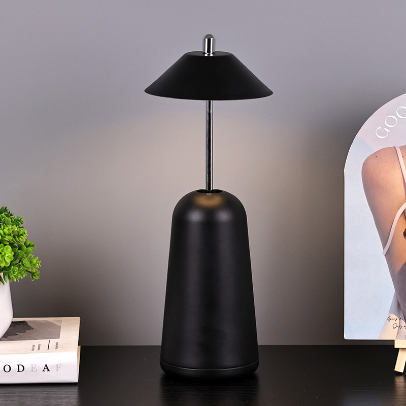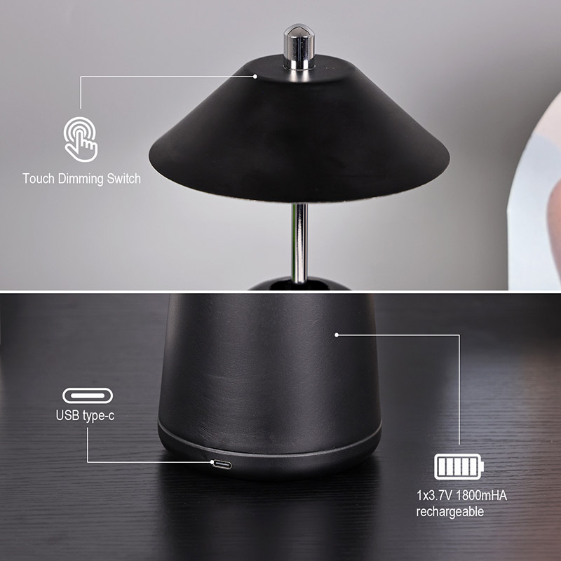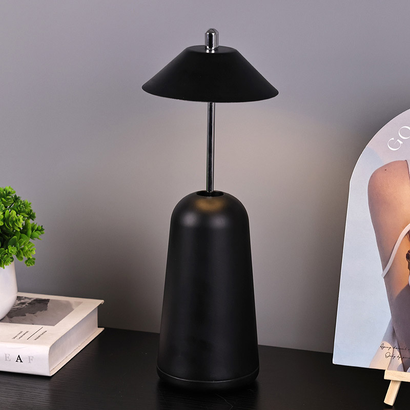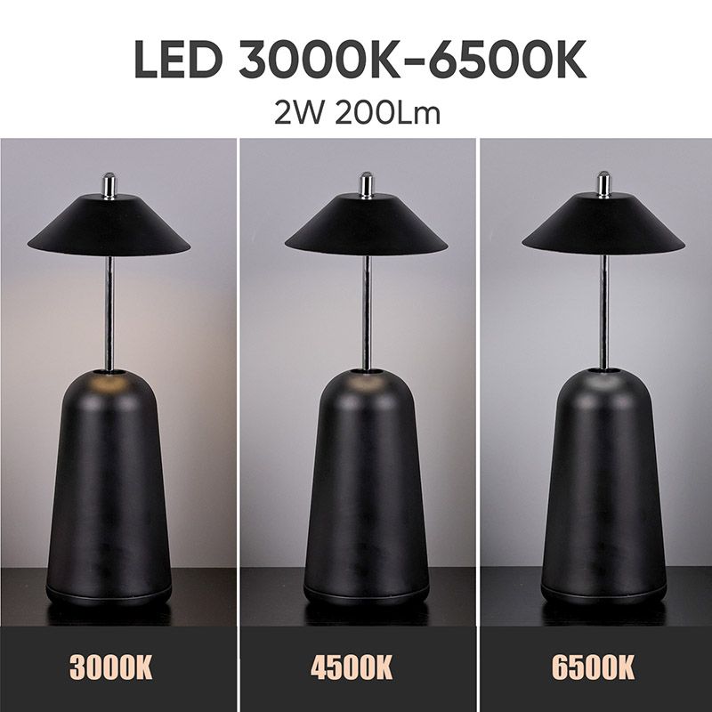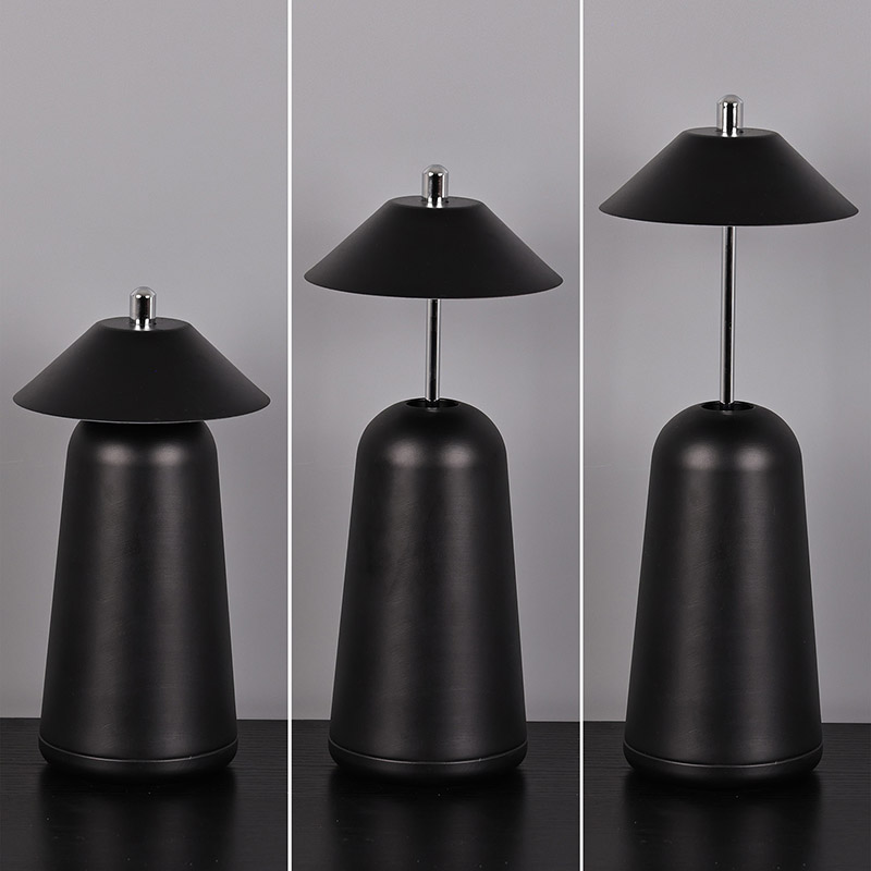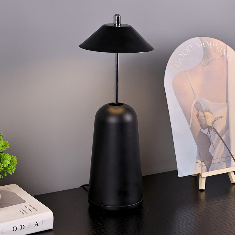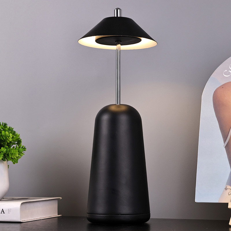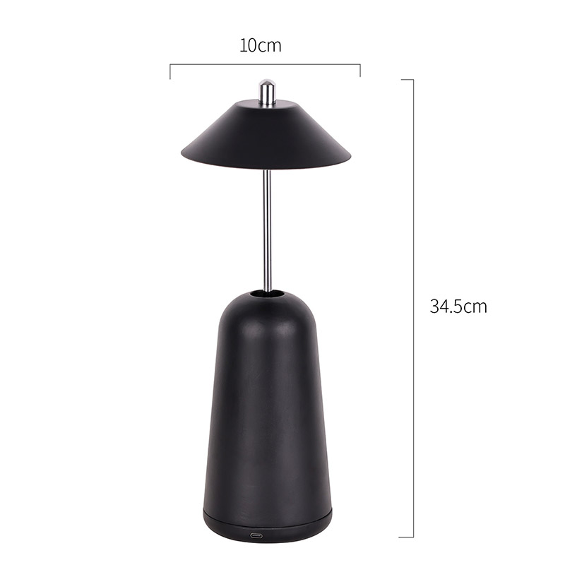 Das Licht der modernen LED-Schreibtischlampe mit verstellbarem Höhenschirm ist innen in den Lampenschirm geschnitten und bietet warme Farben und drei Lichtintensitätsstufen von 3000 K bis 6500 K. Auf der Oberseite des Lampenschirms befindet sich ein Berührungsschalter, ähnlich einer Antenne. Der Sockel besteht aus unregelmäßigem zylindrischem Metall