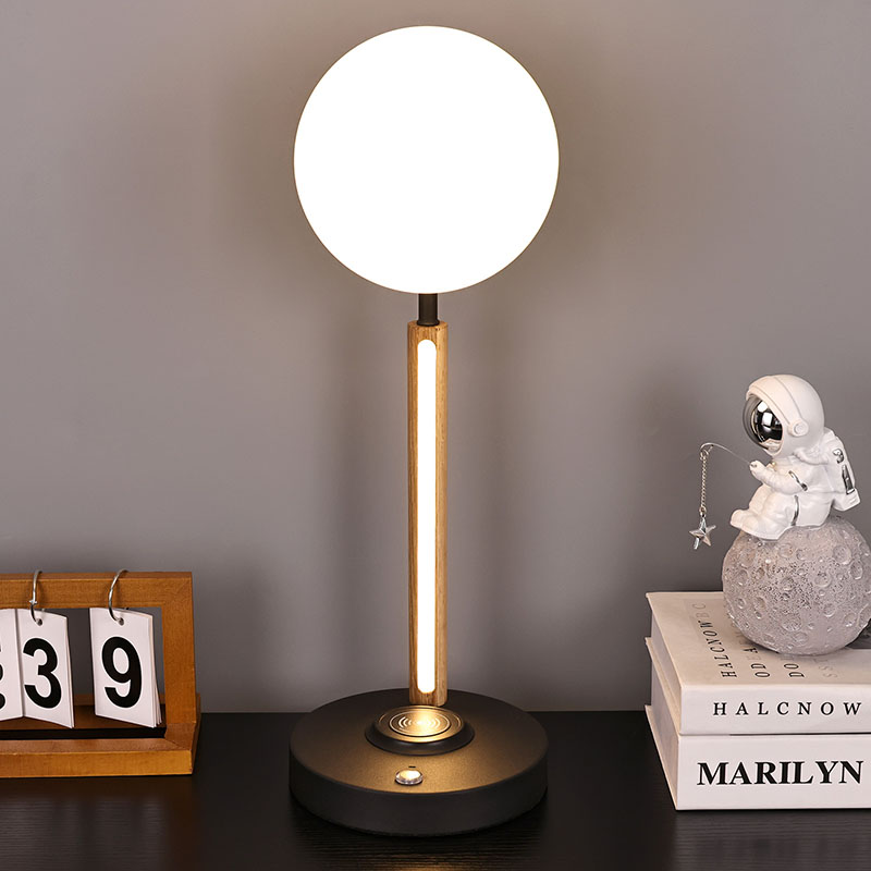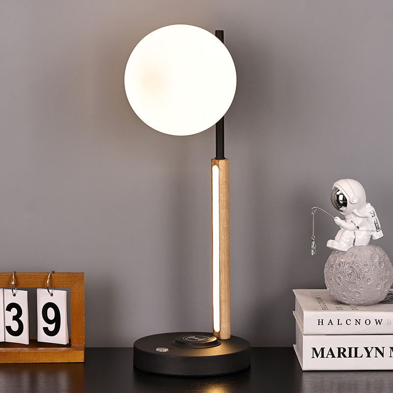 Diese kleine Schreibtischlampe mit kugelförmigem Lampenschirm aus Glas und Lampenkörper aus Holz ist nicht nur ein praktisches Beleuchtungsgerät, sondern auch eine exquisite Dekoration. Es kann in einer Ecke des Wohnzimmers platziert werden und verleiht dem gesamten Raum eine moderne und künstlerische Atmosphäre; Kann neben dem Nachttisch im Schlafzimmer platziert werden und begleitet Sie durch jede ruhige Nacht; Sie kann auch neben dem Schreibtisch im Arbeitszimmer platziert werden und sorgt so für ausreichend und weiches Arbeitslicht.