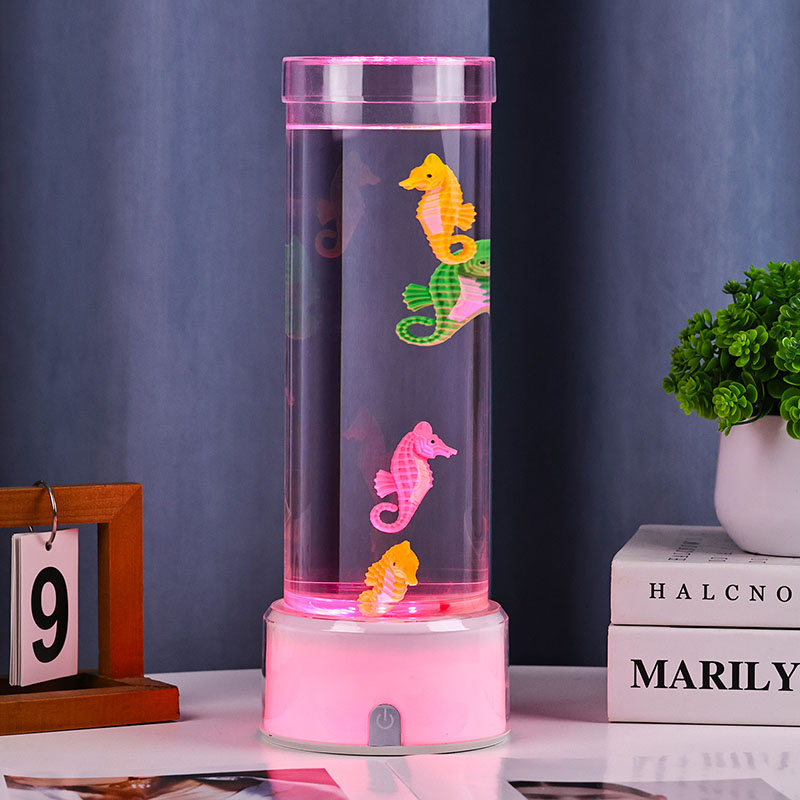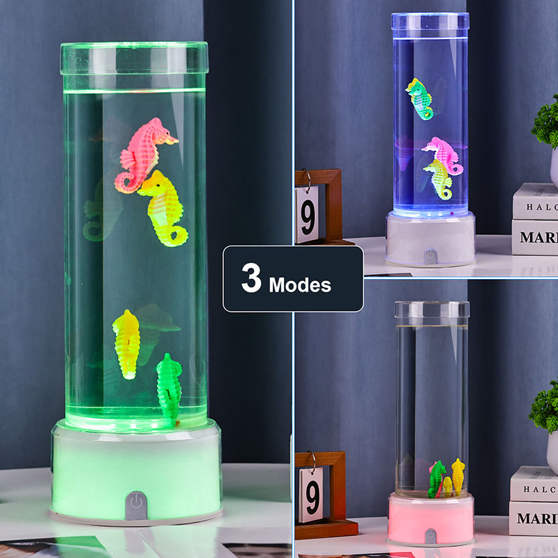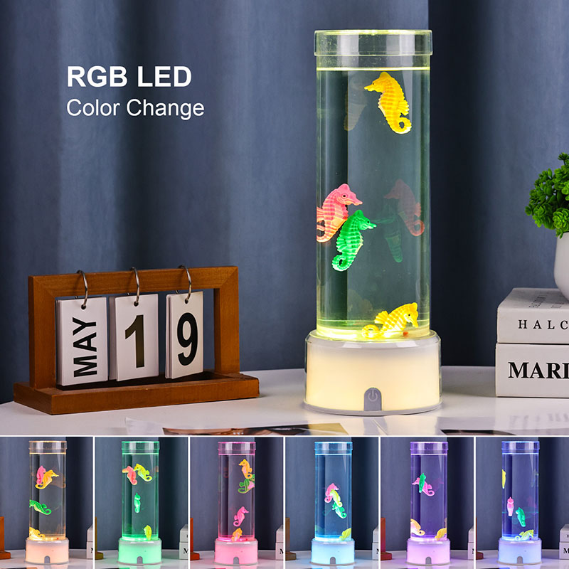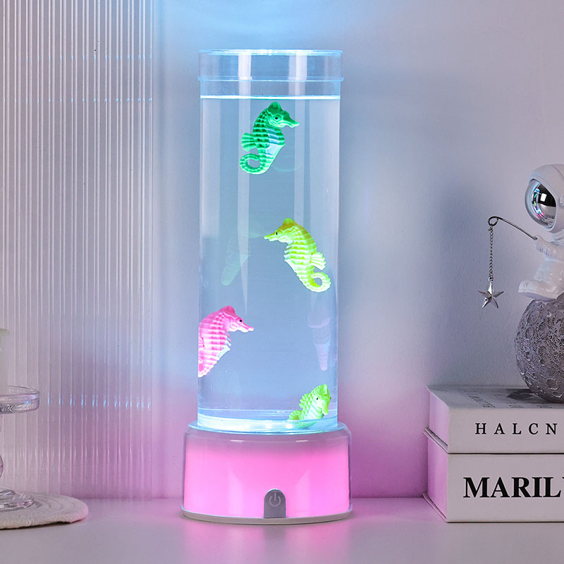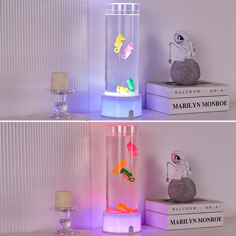 Wir stellen Ihnen die RGB-Farbwechsel-Seepferdchen-Dekorationslampe vor, eine fesselnde Mischung aus maritimem Charme und moderner Lichttechnologie, die jedem Raum Ruhe und Schönheit verleiht. Diese elegante Lampe verfügt über lebensechte Seepferdchenfiguren, die sanft in einer klaren zylindrischen Flüssigkeitskammer schwimmen und so eine Atmosphäre schaffen