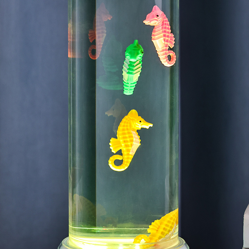 faszinierende Unterwasserszene, die an die Ruhe des Ozeans erinnert. Die gesamte Einheit besteht aus hochwertigem, haltbarem Kunststoff, der sichere Stabilität und lang anhaltende Leistung gewährleistet. Die Lampe ist etwa 30,5 cm hoch und hat ein schlankes, transparentes Rohr, das mit ungiftiger Flüssigkeit und farbenfrohen Seepferdchen-Ornamenten gefüllt ist. Jedes Seepferdchen ist sorgfältig und mit Liebe zum Detail gefertigt und zeichnet sich durch lebendige Farben und realistische Texturen aus Sehen Sie zu, reduzieren Sie Stress und sorgen Sie gleichzeitig für ein beruhigendes visuelles Erlebnis