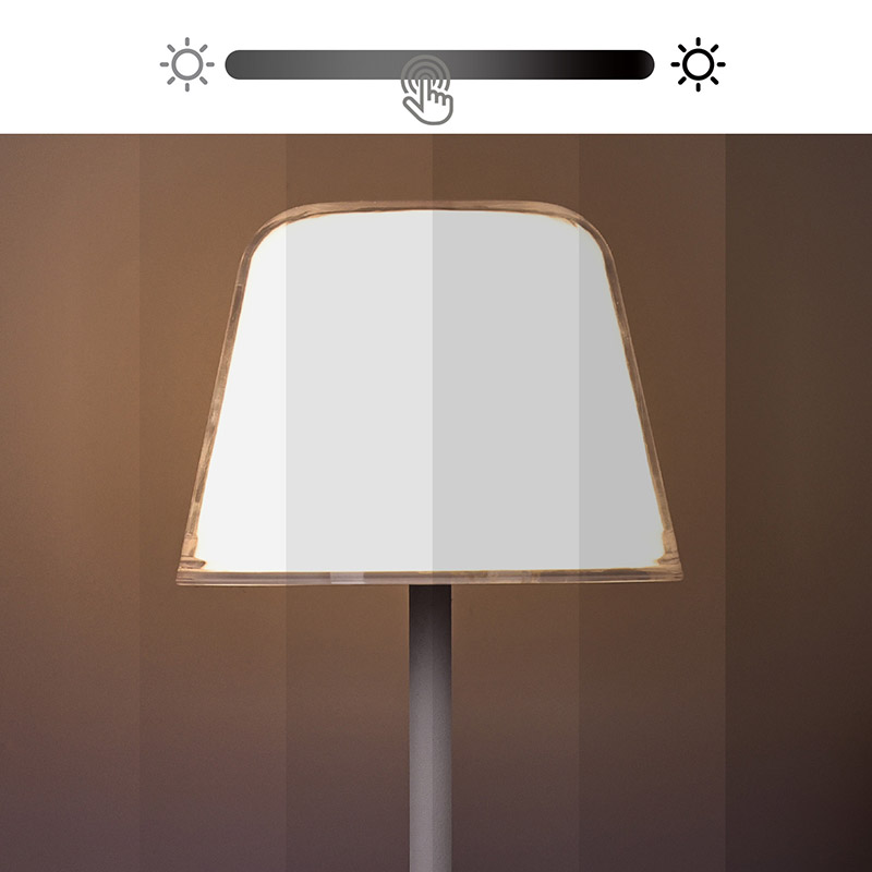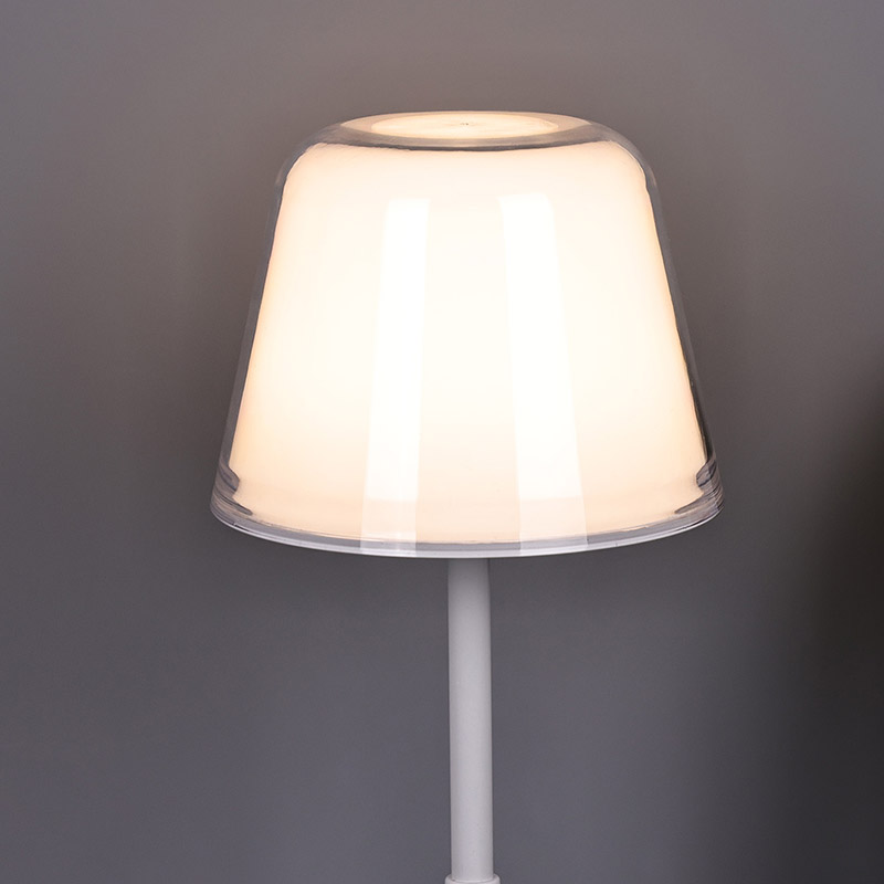 Das dreifarbige Licht der Deko-Deak-Lampe mit glatter Kunststoffoberfläche kann stufenweise in der Helligkeit per Touch-Dimmer eingestellt werden