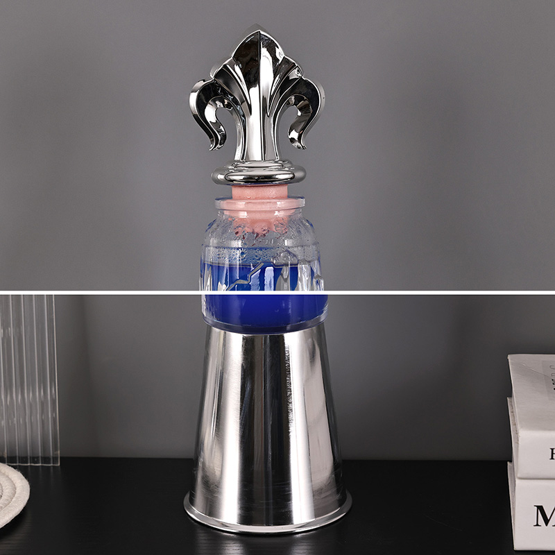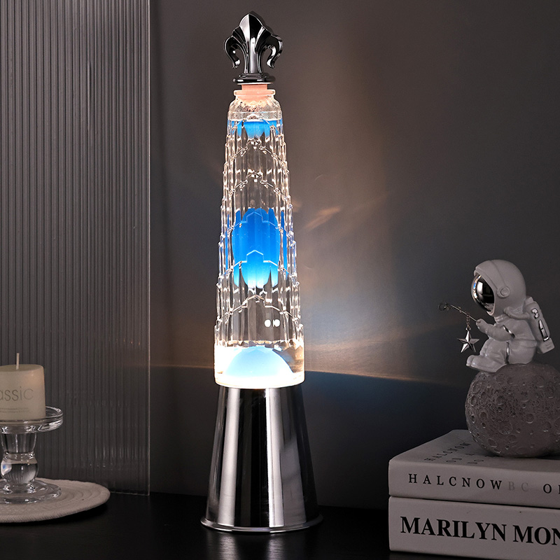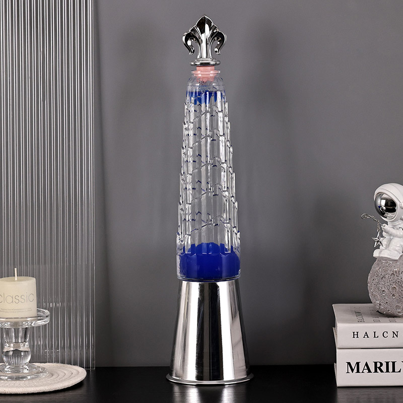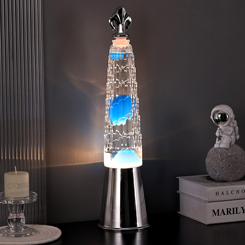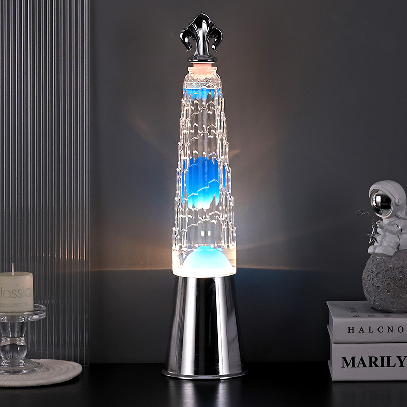 Die Lava-Tischlampe mit Turmschirm verfügt über ein klassisches turmförmiges Design mit exquisiten schwarzen Metalldekorationen an der Spitze, schlicht und doch edel. Im Inneren der transparenten Glasflasche befindet sich blaues Wachs