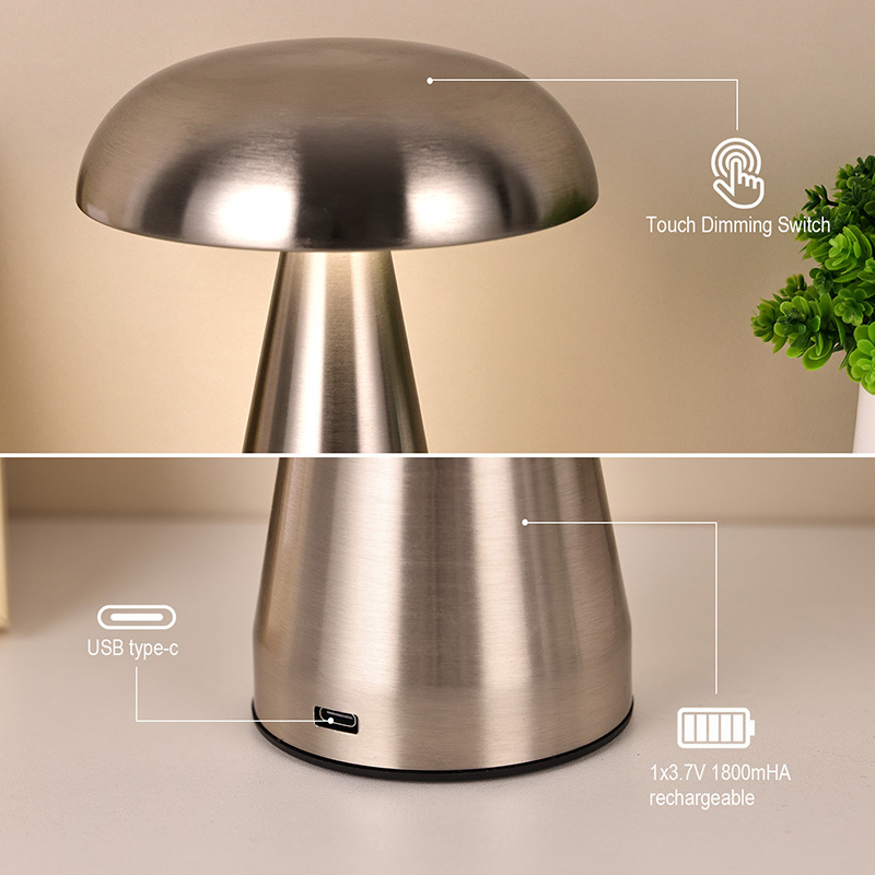 Touch-DimmschalterDie Ganzmetall-LED-Schreibtischlampe mit Pilzschirm besteht vollständig aus Metall und hat ein ganz besonderes Design. Es imitiert die Form eines Pilzes und verfügt über in den Pilz eingeschnittene Lichter mit einstellbarer Stärke. Die Ganzmetall-LED-Schreibtischlampe mit Pilzschirm eignet sich für die Platzierung in Kinderzimmern in einer gesprächsähnlichen Umgebung. Die Ganzmetall-LED-Schreibtischlampe mit Pilzschirm ergänzt die Kinderwelt gut und sorgt für warme Beleuchtung im Raum. Für eine einfache Mobilität verfügt die Schreibtischlampe außerdem über einen integrierten Akku, der jederzeit und überall genutzt werden kann
